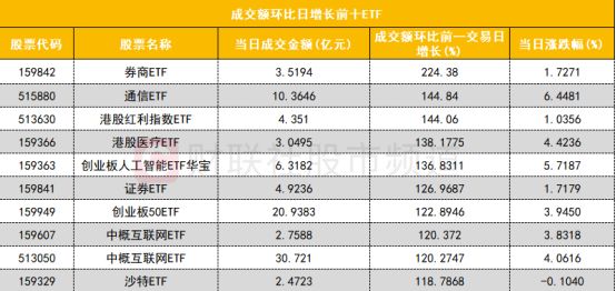 从成交额环比增长前十的ETF来看,券商ETF(159842)成交额环比增长224%位居首位;通信ETF(515880)成交额环比增长144%位居次席。