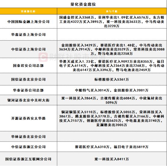 量化资金活跃度有所回升,华胜天成获一家量化席位买入1.23亿;赛诺医疗遭一家量化席位卖出1.48亿。
